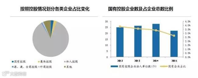 截止到2015年底,全国企业单位数是820.8万个,同比下降0.9%;其中,国有企业数量为11.3万个,占全部企业单位数的1.4%,国有控股的企业单位数为22.1万个,占全部企业单位数的2.7%,占比在过去几年持续下降。总体来看,其中36%的国有企业依然处于亏损状态。在所有权方面,约70%的国有企业是地方所有的国有企业。
