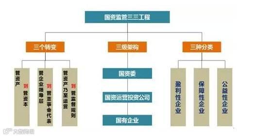 国企改革的监管体系和企业分类,可以清晰的看出国资监管的“三三工程”:三个转变、三级架构、三种分类。基于发展混合所有制带来的国有企业产权变革,改革目前的国有资产监管体制重在实现三个转变,即国有资产监管体制由国资委、国资委监管企业两个主体转变为国资委、国有资本管理机构、国有资本出资企业三个主体;国资委由出资人、董事会的双重职责向“干净”的出资人转变;国资委监管企业由国有资本管理职能、业务经营职能向国有资本管理职能或是业务经营职能的转变。