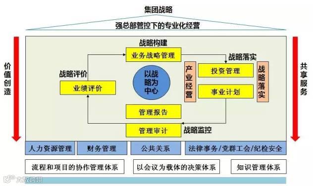 不管是产业平台类或资本投资类国企,都应该在战略管控为管理模式,需要建立的是以集团与子公司战略构建、关键的人和财等资源的有效管理能力,可以建立以战略引领为导向的强总部下的专业化经营管理体系,通过价值创造和共享服务两条红线落实企业战略,并通过人力资源、财务管理等职能管理模块,建立三个体系:流程和项目的协作体系、以会议为载体的决策体系和知识管理体系,把传统的地方国企改造成为高效率、高价值的市场竞争主体。