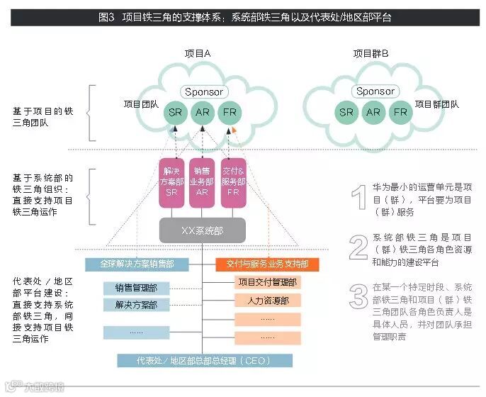 ◎组织保障。为了保证铁三角的有效运作,相应的绩效考评、商务授权、及时激励和财务权签都需要落实到系统部以及相应的项目核心团队。