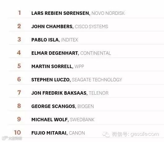 享誉业界的《哈佛商业评论》(HBR)2015年11月刊公布了2015全球最佳CEO百人榜,丹麦医药巨头诺和诺德(Novo Nordisk)首席执行官索文森(Lars Rebien Sorensen)荣登榜首,思科公司的钱伯斯名列第二,第三名是ZARA母公司Inditex集团的PABLO ISLA。中国台湾的鸿海集团CEO郭台铭位居33名,在亚洲仅次于日本佳能的首席执行官小泽秀树(第十)。