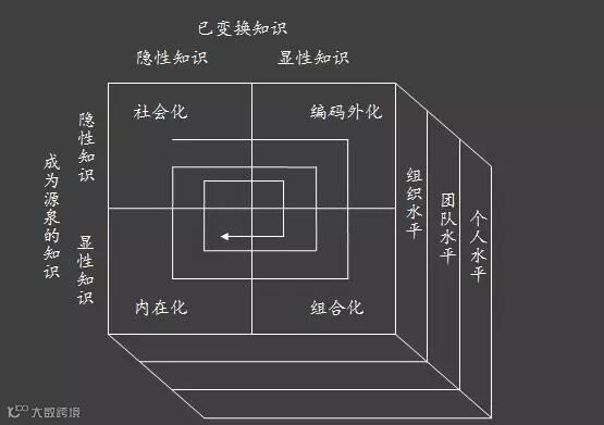 在企业里面,先是人和人进行交流,隐性知识被编码为显性知识,这些显性知识组合在一起形成知识系统,接触到的人内化到自己的行为当中,完成一个循环。从个人层面到团队层面再到组织层面,螺旋上升,就形成一个企业内部的组织知识和组织能力,没有任何一个人走了之后就可以带走组织能力。