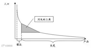 有一个长尾理论的模型(图1),有一块产品是巨头产品(爆款),还有一块是长尾,长尾真正的面积加起来一定会比巨头大。但是产品的生产线是不可以无限拉伸的,因为无限拉伸会冲散供应链。所以做生产制造的,可以专注于巨头与长尾之间的市场,这个位置是他们的舒适区(三角区)。