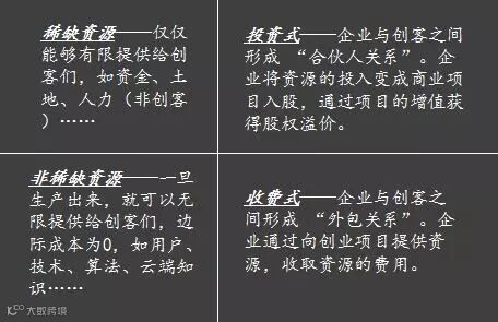 有两类资源,一类是稀缺资源,可以有限的出让,包括土地、资金,人力等等;一类资源是非稀缺资源,一旦产生出来就可以无限的提供给创客们,边际成本为零,包括用户、技术、算法,云端等等。