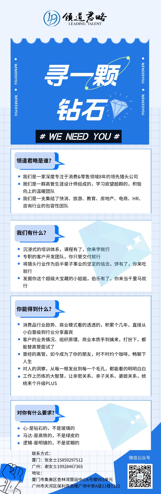 领道君略是一家专注于消费零售领域的人力资源综合服务商。 我们的使命是聚焦客户关注的挑战和压力,提供极具价值的人力资源综合解决方案,立志成为消费零售领域值得信赖的人力资源合作伙伴。
