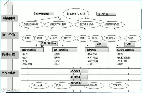 战略地图是一种有效的工具,直观地揭示了各个战略目标之间的因果关系。这个因果关系链从公司的长期财务目标开始,然后连到客户忠诚度目标和公司的价值主张,再接下来是与关键流程相关的目标,最后是成功实施战略所需要的人员、技术,以及组织环境和文化。