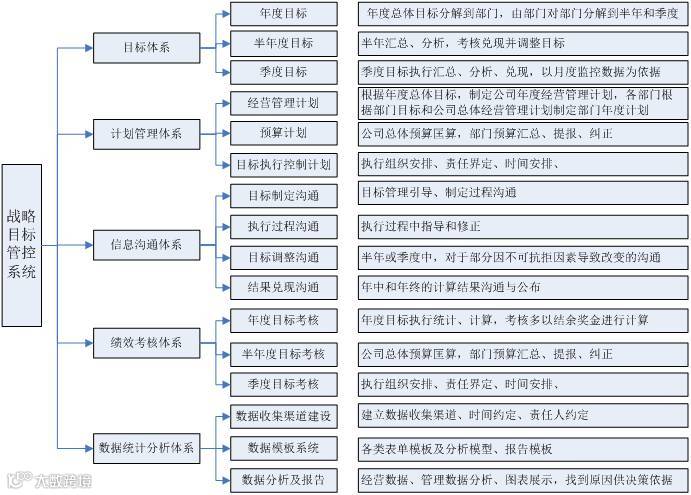 战略目标管控系统主要包括几个方面,主要有战略目标体系、计划管理体系、信息沟通体系、绩效考核体系、数据统计分析体系组成。通过以下五大系统的完善和实施,基本能将公司制定的战略目标相对矛盾较少的情况下落实到位。