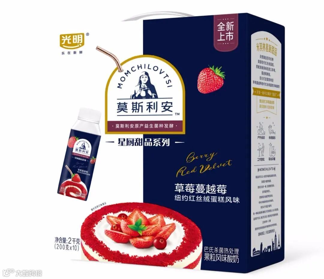 红丝绒蛋糕是美国的一款传统蛋糕,这款产品属于莫斯利安“TT星厨甜品系列”,是经典与新潮的再创造。使用莫斯利安原产益生菌种发酵,并添加进口草莓、蔓越莓果粒,真实果肉。口味上有别于目前市场上成熟草莓的味道,带来清新草莓的口感。草莓、蔓越莓果粒的酸甜,融合酸奶的醇香,尽享甜蜜好滋味。打破常规乳制品浅色系包装,以高贵典雅午夜蓝为背景,带给消费者眼前一亮的感觉。