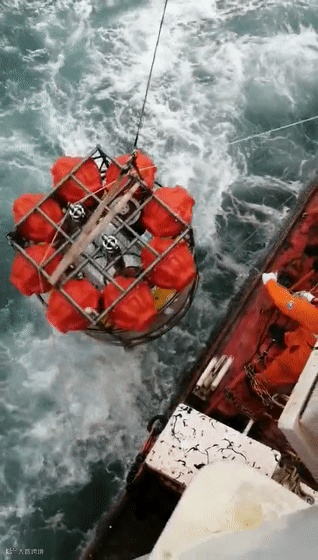 中午11点50分,目标接近船体,观察人员通知准备打捞,此时大家正在餐厅吃午饭,听到号令,大家纷纷往嘴里抢扒几口,匆忙放下碗筷,迅速奔向船尾。记者也迅速赶到船尾的二层甲板上,从左侧的观察孔伸出脑袋,此时目标体正紧挨着船尾的左侧边漂浮。船长进一步校准位置,12点整,船尾正对着两米开外的打捞目标,此时站在船尾甲板上的技术人员迅速甩出带铆爪的绳子,一下子勾住了目标体,众人纷纷使劲往船边上拽。船上的起吊设备也迅速启动,12点10分,在海底工作了一个昼夜的海底海洋要素边界层监测系统终于被打捞上船,所有人长长嘘了一口气。但是,由于风高浪急,海况不佳,为保障海洋地质九号和船上人员的安全,杨源指挥大家割断连接原计划一起打捞上来的铁饼的绳子,放弃打捞,寻找附近港湾避风。原定下午的海试计划也只得放弃。