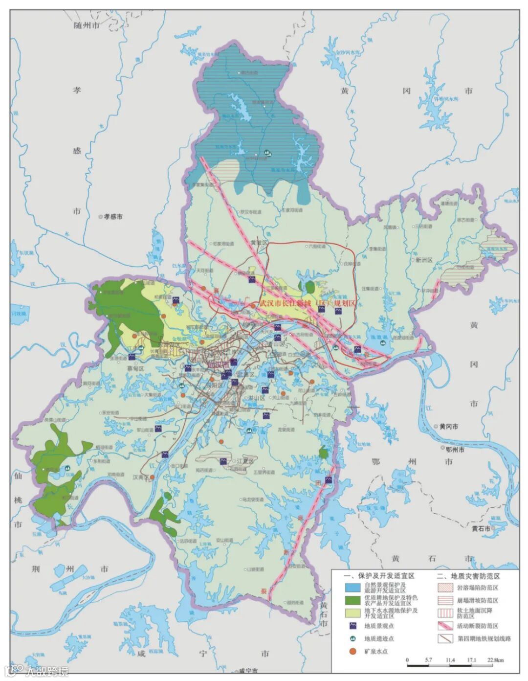 四是根据武汉市优势地质资源和主要环境地质问题,结合武汉市重大功能区规划,为武汉市国土空间规划和开发利用提出了科学建议。区内有5个优质耕地保护及特色农业开发适宜区、2个地下水水源地保护及开发适宜区,应加大自然景观保护及旅游开发适宜区、优质耕地保护及特色农业开发适宜区、地下水水源地保护及开发适宜区的资源开发利用,并在开发中做好保护。