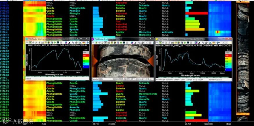 基于多参数数字化技术获取岩心图像及成分数据。基于岩心多参数数字化技术,对岩心进行了高清彩色图像、短波红外、热红外光谱扫描数字化工作。基于短波波段(380~2500nm)红外光谱数字化技术,获取了岩心的云母、绿泥石、碳酸盐类和硫酸盐类等矿物成分信息。基于热红外波段(6000~14500nm)光谱扫描及解译,获取了岩心的石英、长石、橄榄石、辉石等矿物信息。