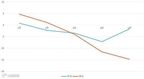 下游方面,原材料工业出厂价格环比降幅收窄,同比继续下降:5月份,原材料工业出厂价格环比下降1.1%,同比下降9.9%,1-5月平均同比下降5.4%。其中,石油、煤炭及其他燃料加工业价格环比下降4%,同比下降24.4%,1-5月平均同比下降10.4%;化学原料和化学制品制造业价格环比下降1.2%,同比下降9.2%,1-5月平均同比下降6.3%;黑色金属冶炼和压延加工业价格环比持平,同比下降8%,1-5月平均同比下降4%;有色金属冶炼和压延加工业价格环比上涨1.6%,同比下降4.4%,1-5月平均同比下降2.1%;非金属矿物制品业价格环比下降0.3%,同比上涨2%,1-5月平均同比下降0.6%。