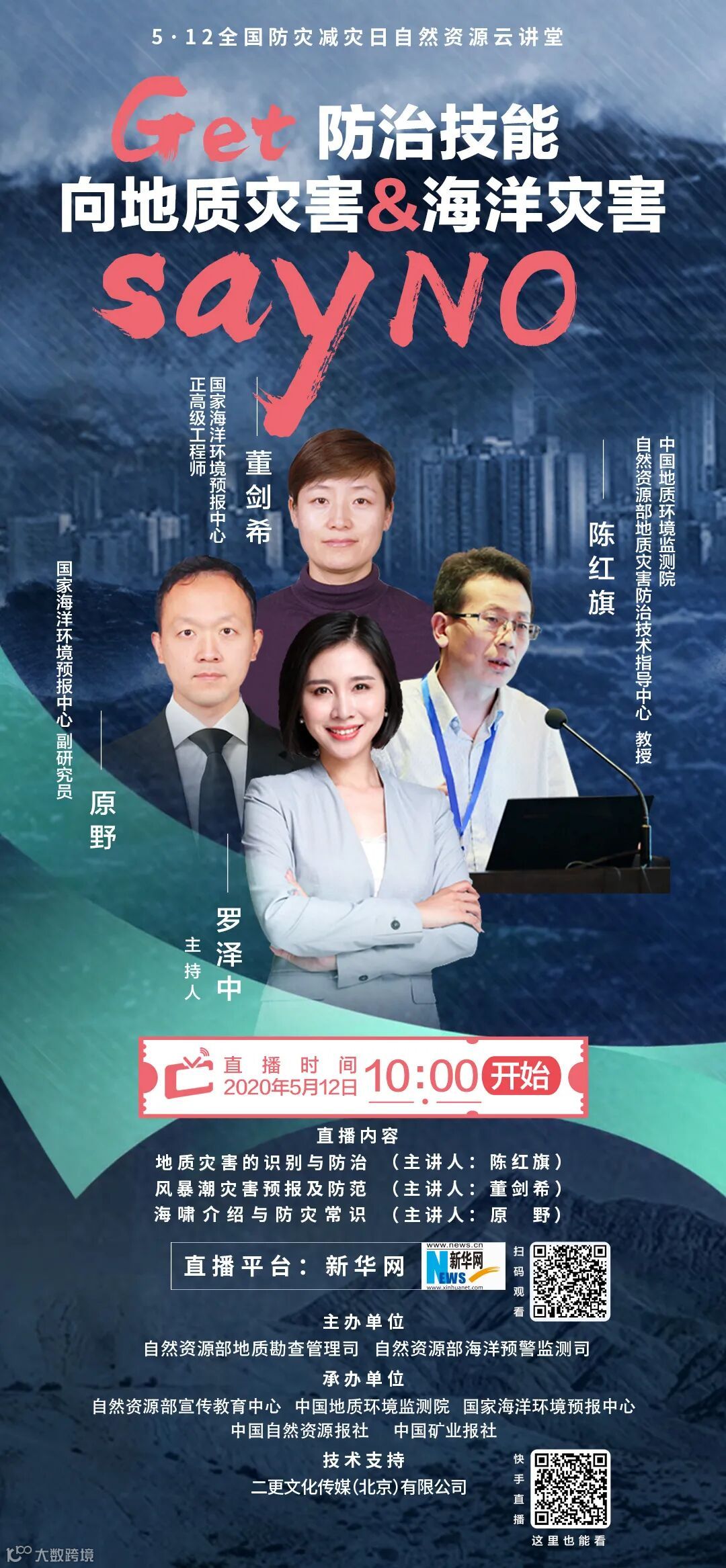 在第12个全国防灾减灾日到来之际,自然资源部推出“5·12全国防灾减灾日自然资源云讲堂”直播活动,带你走进地质灾害和海洋灾害防治讲堂,一起“Get防治技能,向地质灾害和海洋灾害Say NO”。