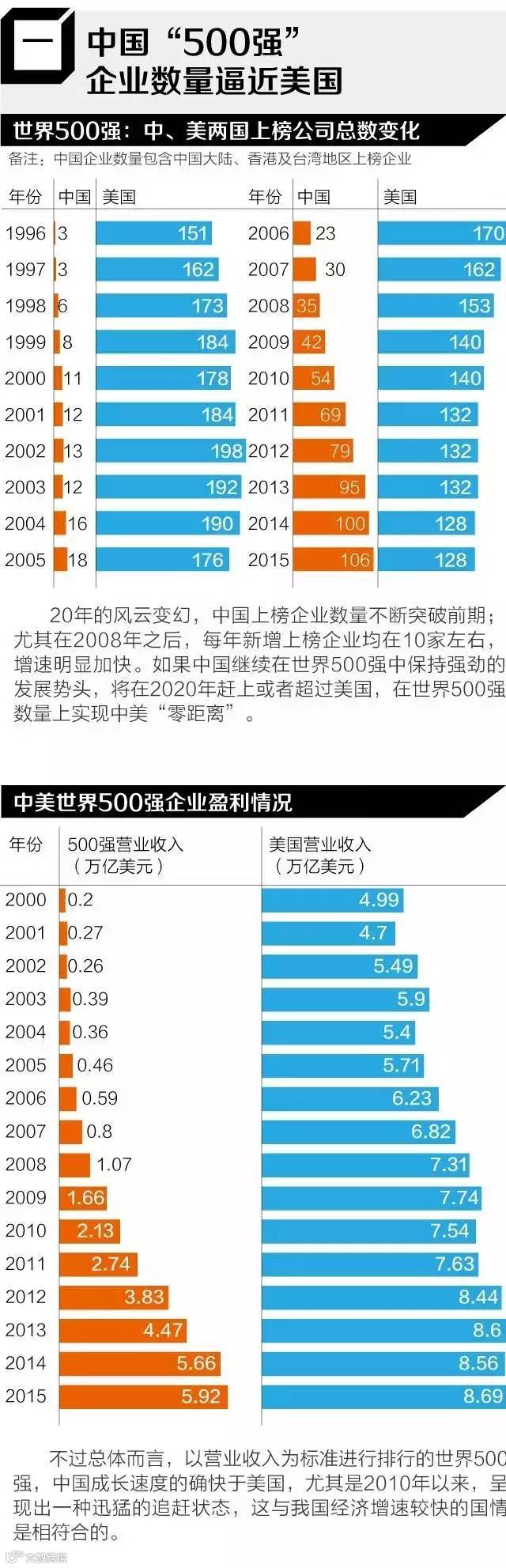 2015年世界500强榜单显示,中国企业上榜数量仅次于美国,位居第二。