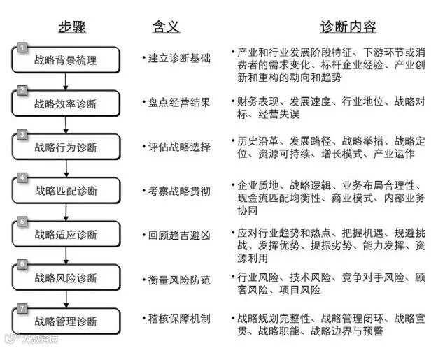 在指导思想上,战略诊断需要按七个步骤展开:以产业生态和行业变迁为判断基础;以企业的发展沿革、经营效果为重要线索;从企业的实际战略举措中识别战略意图和行为,并评价成败得失;综合权衡战略布局和要素之间的内在匹配;推演发展趋势,力求适应和创造未来;有效管理目前面临的重大战略风险;规范化战略管理过程。