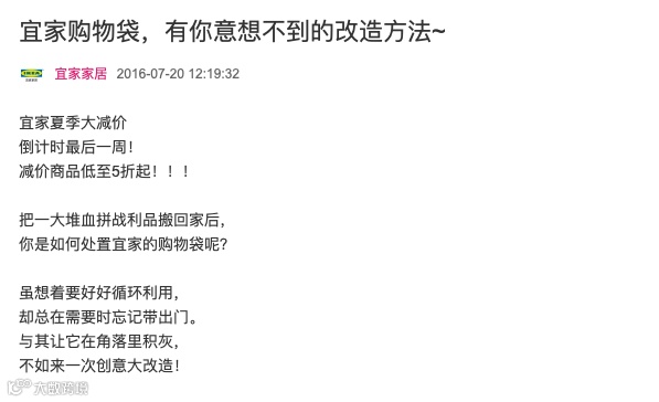 而宜家在营销端做得更近一步的一点在于,他还通过有意无意的围绕弗拉塔购物袋的「可改造性」的引导,在增加弗拉塔购物袋实际使用价值的同时,也构建了独特的品牌仪式,让弗拉塔购物袋拥有了更多的故事可讲。