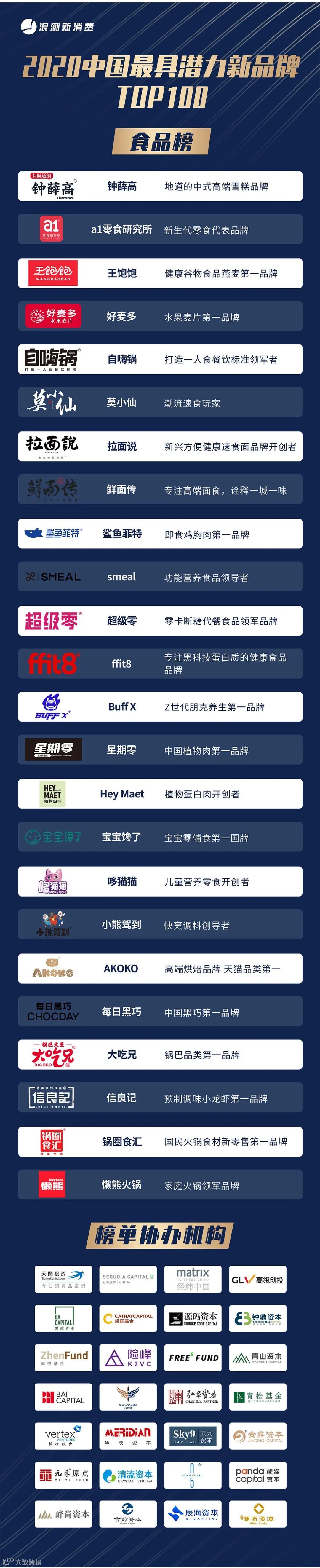 以下是《2020年中国最具潜力新消费品牌TOP100》食品类入榜企业: