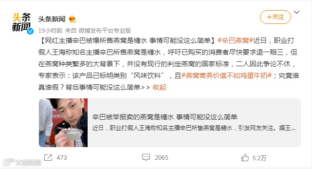 职业打假人王海在微博上表示,「经过检测,@辛选官方微博@辛有志xyz当燕窝忽悠粉丝的风味饮料就是糖水。据检测结果,该产品蔗糖含量 4.8%,而成分表里碳水化合物为 5%,确认该产品就是糖水。」