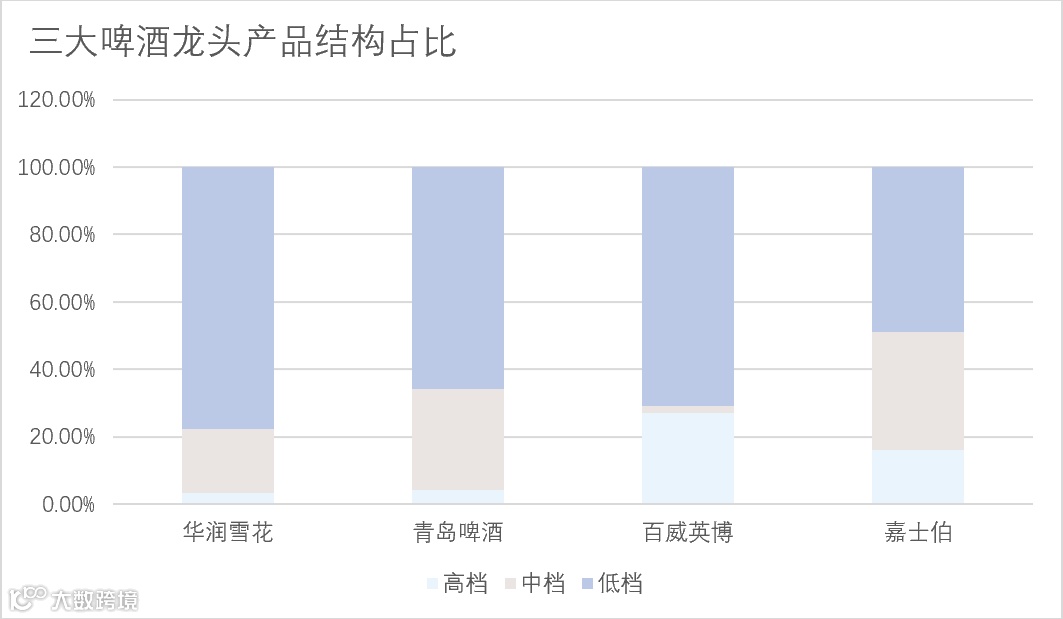 对比高中低档全面布局的四家全国性啤酒企业各自的产品结构。百威英博得益于百威大单品在夜场的强势,其高档酒占其27%的销量;嘉士伯拥有嘉士伯品牌、1664等国际高档产品,再配合本地的高档品牌发展,高档占比也达到了16%;而华润和青啤由于高档化起步较晚,高档酒销量占比不到5%。而从中低档看,由于嘉士伯率先进行产品结构升级,将低档向中档提升。因此其腰部产品突出,中档占比达到35%,低档占比不到50%,优于其他三家啤酒企业。