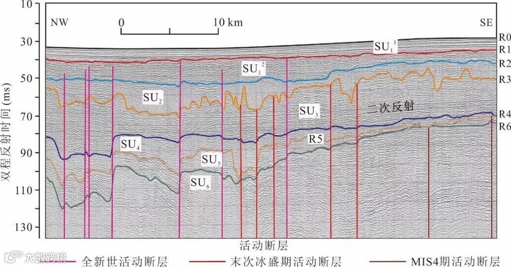 (SU1-SU5分别对应MIS1-MIS5期的声学地层单元,R0-R6为介于其间的声学地层界面)