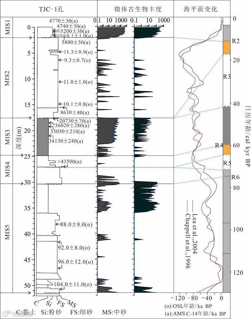 (虚线代表不同沉积单元间的界面(R2-R6),灰色阴影部分对应MIS5期、MIS3期、MIS1期海相地层)