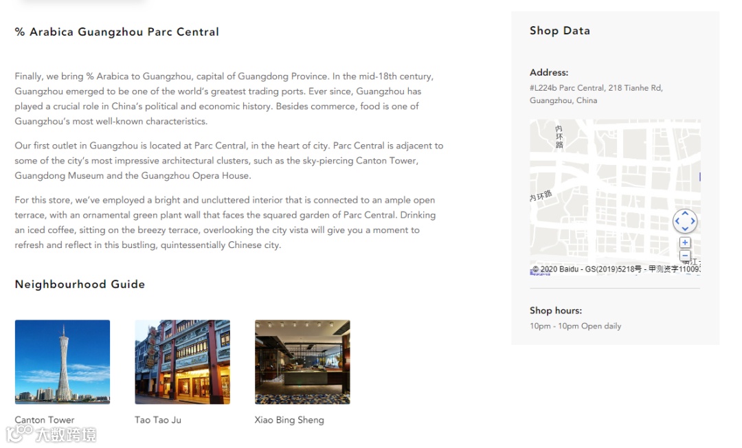 打开%Arabica的网页中的店面地点,我们可以看到每一家店铺,都会有一段设计说明和背景故事,而在故事的下方,则标记着当地值得一去的文化、餐饮等旅游景点。