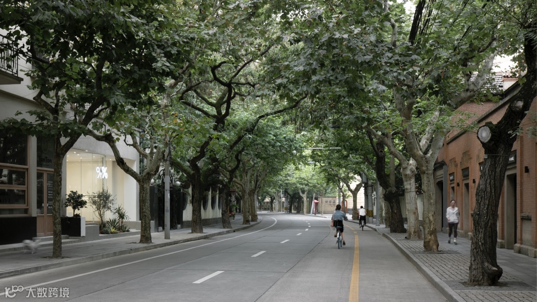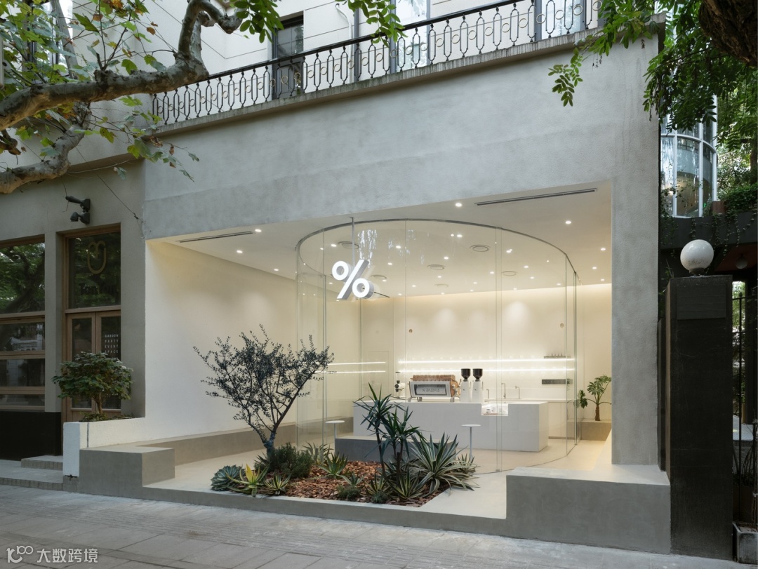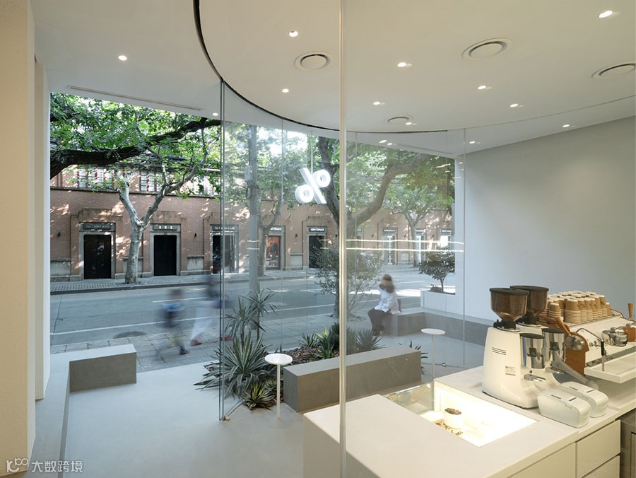 建国西路本身就是一条绿意环绕、郁郁葱葱的老街,店门口的绿植与混凝土的高级灰色,让门店完美融入了街道,一点也不突兀,视觉上也非常的和谐舒适。