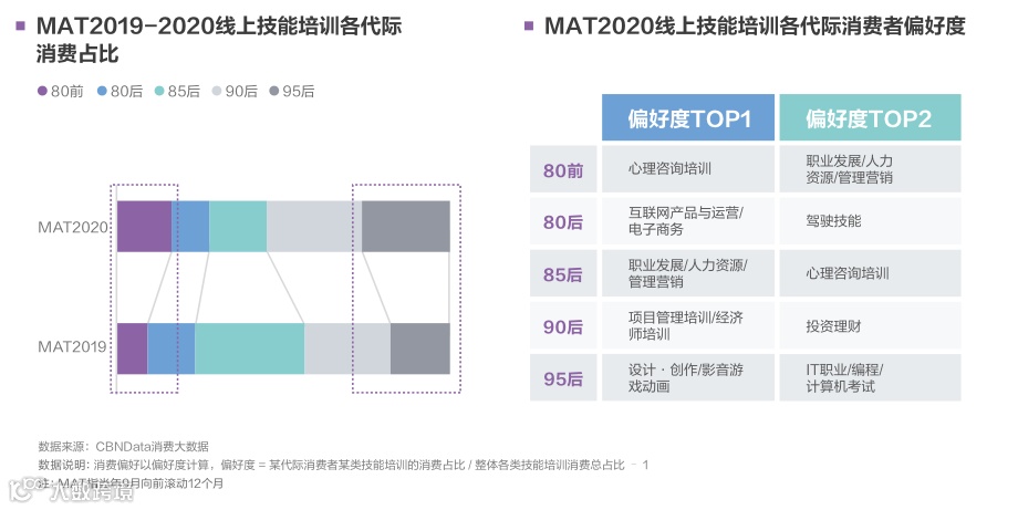 疫情也给国民带来了前所未有的职场焦虑,大众的“求知欲”大幅提升。CBNData《报告》数据显示,围绕着职场技能的提升,80 前、95 后消费者快速涌入市场, 80 前偏好心理咨询培训和职业发展类课程,95 后则偏好设计 / 动画以及 IT 类。泛知识类内容也在全面升温,硬核的半佛仙人、毕导等B站UP主作品兼具娱乐性和科普性,成为年轻人偏爱的知识获取渠道。