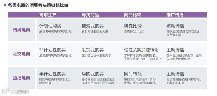 直播的导购式购买形式能够实现瞬时、高效的转化效率,相较传统电商和社交电商,在消费者需求的激发、满足、传播上都具差异性。随着明星、CEO 等人群进入直播间,流量带货成绩屡屡刷新。带货的品类边界也在不断延伸——从日用快消品到火箭等稀有物种、房产类大额商品、投资理财等具专业门槛的商品服务纷纷走上直播间。从目的上来看,带货不再是唯一的目标,直播间成为品牌建设、宣传和教育市场的场所。