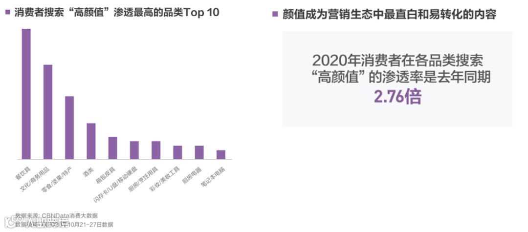 同时,互联网去中心化的结构以及反馈机制使产品本身成为最好的内容载体。根CBNData《报告》,2020年消费者在各品类搜索“高颜值”的渗透率是去年同期的2.76倍。善于讲述品牌故事,或通过颜值上的感官刺激直达消费者,成为品牌出奇制胜的法则。