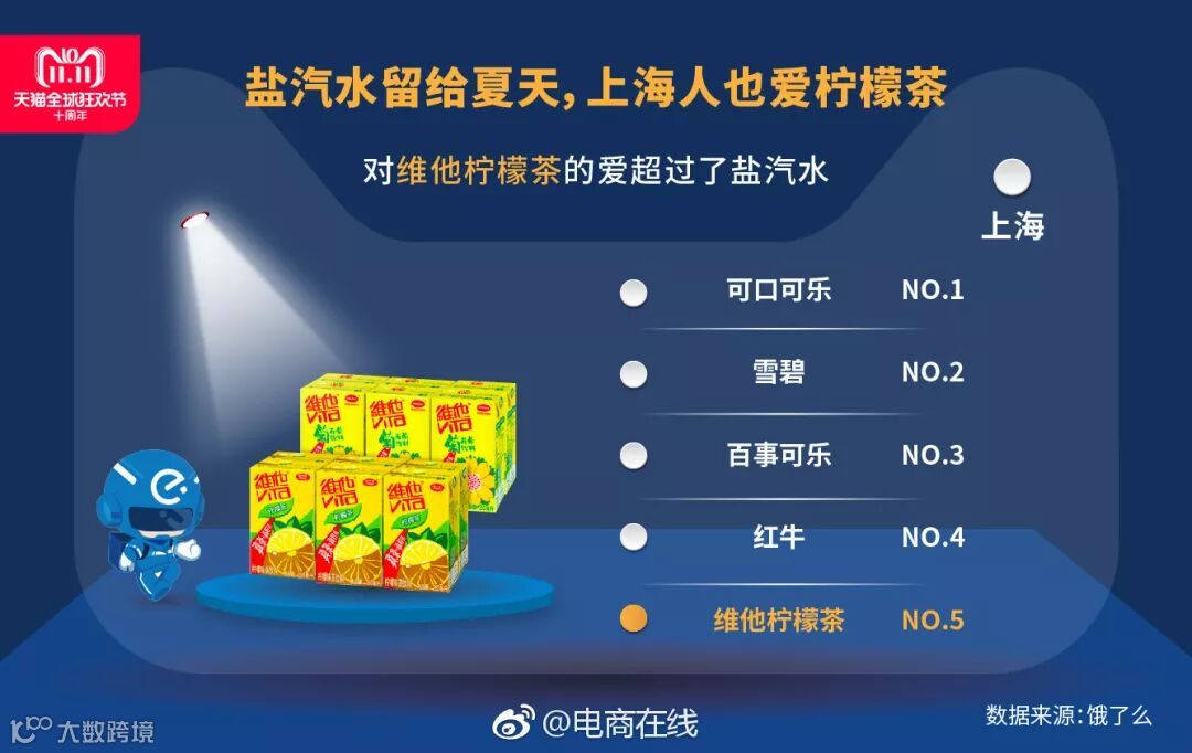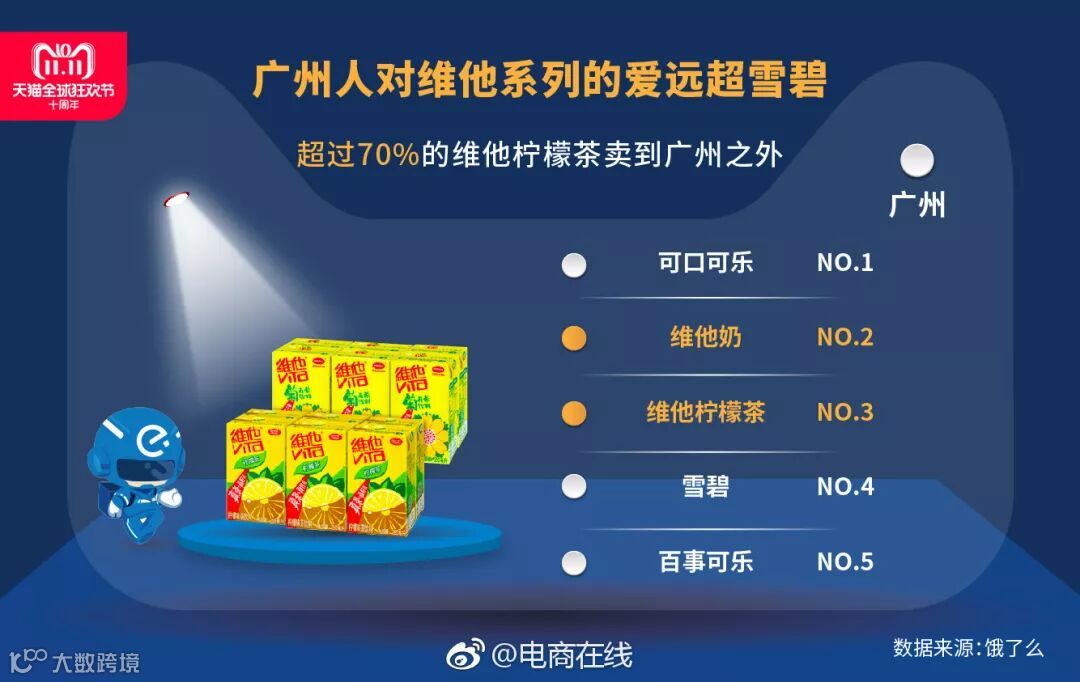 2018年11月,根据饿了么发布的《天猫双11肥宅快乐水城市榜》,维他柠檬茶销量轻松跑赢其他茶类软饮。