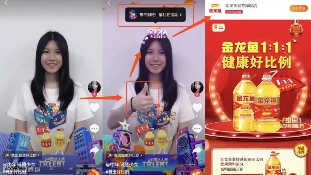活动中,金龙鱼直接将中国达人秀“搬”上了抖音平台,每一位用户都能在活动中化身全能达人,在酷炫的达人秀舞台与金龙鱼小油人互动,同时通过点赞手势触发贴纸彩蛋,点击贴纸即可跳转金龙鱼官方旗舰店,真正做到了品效合一。