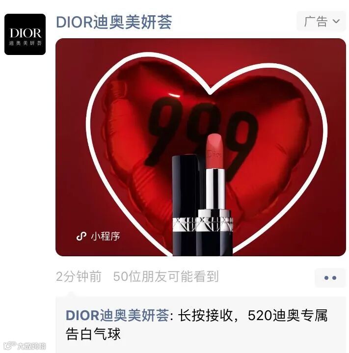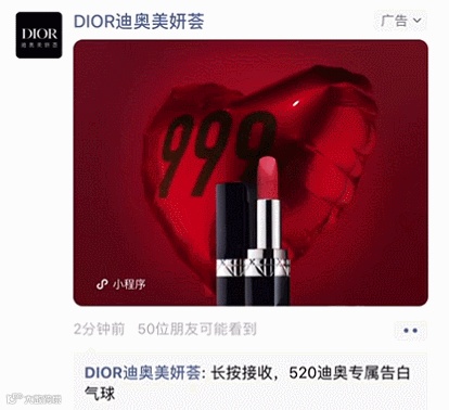 今年,在同样面向情侣用户的520告白日,迪奥美妍荟也在微信朋友圈投放了长按式卡片广告。