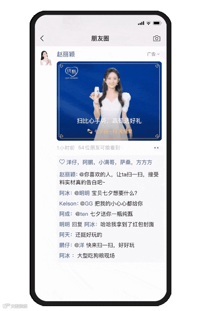 今年七夕期间,蒙牛纯甄、七喜、Tom Ford Beauty都在微信朋友圈的互动广告中,加入了“扫一扫”的标签提示,大大延长了用户与品牌互动的时间。