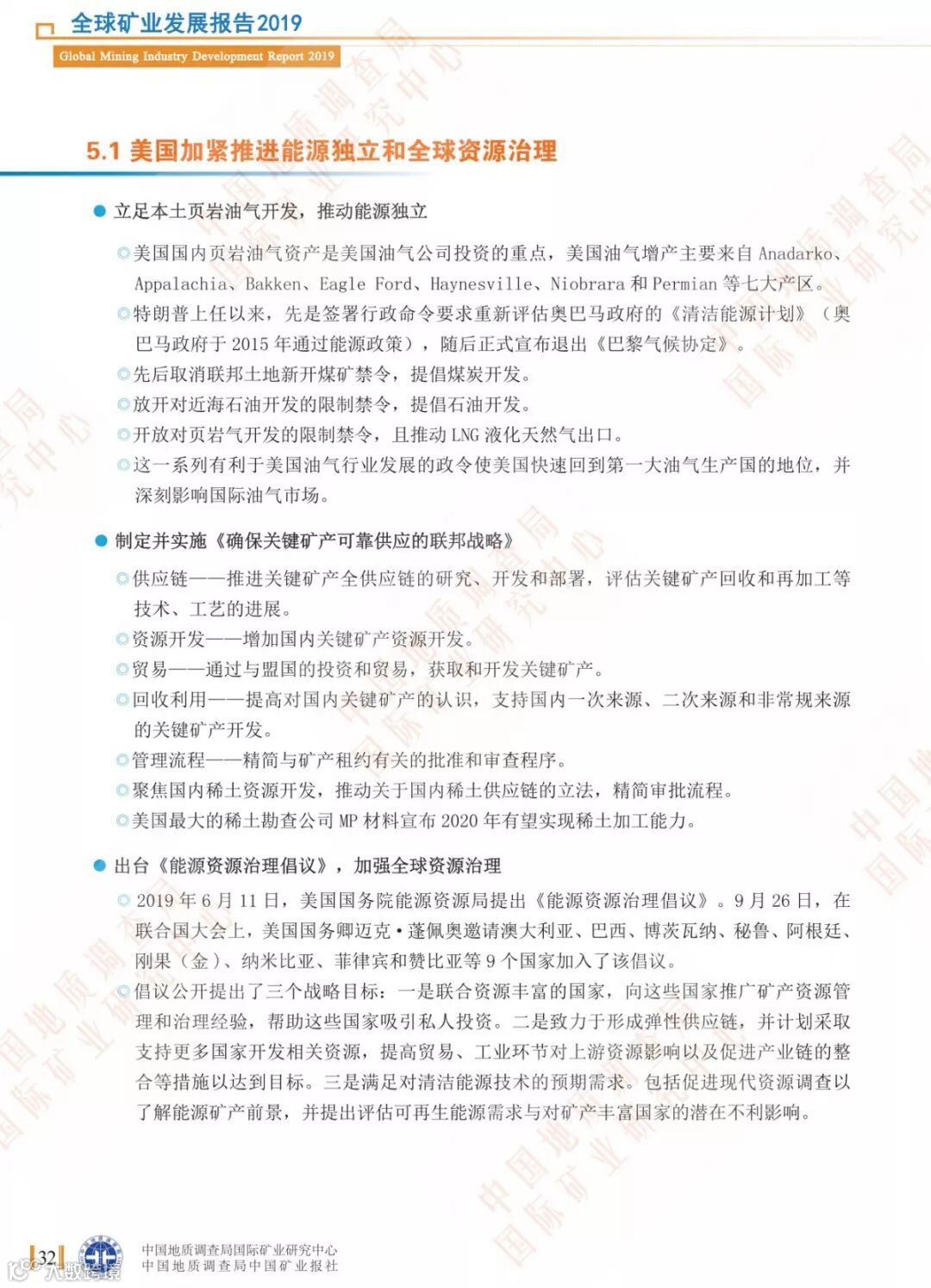 美国出台《能源资源治理倡议》,加强全球资源治理。目前已有澳大利亚、巴西、秘鲁、阿根廷、菲律宾、刚果(金)、赞比亚、博茨瓦纳、纳米比亚等9个国家加入。一是向这些国家推广矿产资源治理经验。二是致力于形成弹性供应链,提高贸易、工业环节对上游资源影响。三是评估可再生能源矿产生产对矿产丰富国家的不利影响。