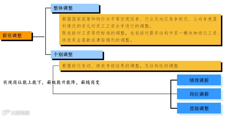 同时,根据公司内、外部经营环境的变化,建立公司整体调薪和个别调薪(包括岗位调薪、绩效调薪和晋级调薪)相结合的常态化薪酬调整机制,适时调整员工的薪资水平,充分发挥薪酬的激励作用。其中,绩效调薪和职位通道等级的晋级调薪为调整的主要方式,如图8所示: