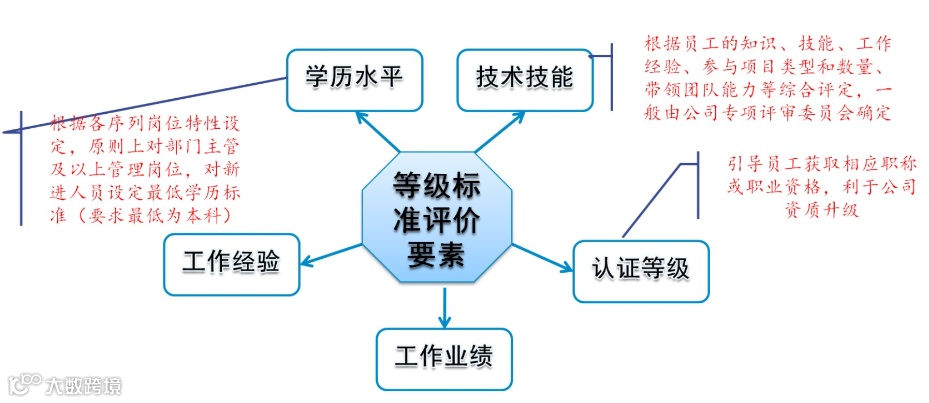 如上图所示,对工程师队伍,除有管理潜力和能力的员工可参与公司管理岗位竞聘外,员工可以依据自身的技能等级(依据知识、技能、工作经验、参与项目类型和数量、带领团队能力、工作绩效等综合确定),形成向上的职业发展通道,员工技能等级增长,员工相应的薪酬福利待遇均可以增加,从而形成鼓励技术类员工安心本岗、钻研技术的良性工作氛围。