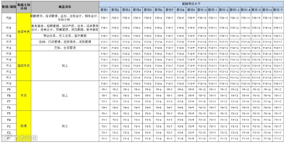 该公司职能序列共分助理、专员、高级专员、资深专员四个通道等级,在每一个职位通道等级将上图岗位评价结果代入,则共设20个薪级,在每一个薪级上对应设了若干个薪档(该公司为17档,表示每个职级上所有岗位根据绩效表现所能调整的薪资区间),形成了该公司职能类员工的薪资等级表,如图7所示: