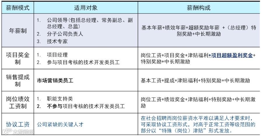 在薪酬体系改善上,首先应该贯彻“差别化”原则,对不同职位层级的员工,采用不同的薪酬模式;同时对不同类别的员工,采用不同的薪酬结构(值得注意的是,本文中所指薪酬仅包含工资、福利和奖金等短期性收入,科技型企业如能配套进行股票、期权、分红等中长期激励,激励效果将更佳)。常见的薪酬模式如图5所示: