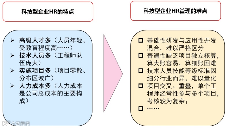 科技型企业一般具有“高级人才多、技术人员(即工程师)多、实施项目多、人力成本多”的“四多”特点,因而与传统企业相比,其HR管理的难点也有所差别,如图1所示: