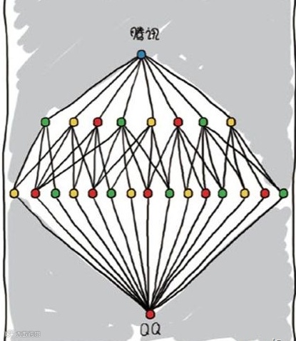 腾讯是个令人费解的内外两重世界,就像一堵围墙,墙内的人觉得公司简单欢快如大学校园,墙外的人却觉得企鹅彪悍且来势汹汹。反映在腾讯的业务和组织架构,这种矛盾性也处处存在。经过几次大大小小的架构调整,腾讯将不断增设的新部门重新归类后细分为八大单元。其中,根据业务体系划分出四个业务系统—无 线业务、互联网业务、互娱业务、网络媒体业务;另外,根据公司日常运转划分出四个支持系统—运营支持、平台研发、行政等职能系统及企业发展系统。看起来很 清爽吧?可是当找出腾讯的产品与服务结构图来比较就会发现,腾讯产品与部门之间有着千丝万缕的关系。而此中的原因便是,作为腾讯盈利的法宝,QQ不仅是即 时通信平台的核心,也搭载或捆绑着腾讯诸多产品与服务。想了解这一点?打开任何一个QQ互联网端界面就知道了。