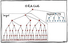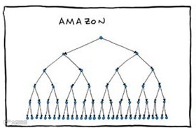 Web设计师Manu Cornet在自己的博客上,画了一组美国科技公司的组织结构图。在他笔下,亚马逊等级森严且有序;谷歌结构清晰,产品和部门之间却相互交错且混乱;Facebook架构分散,就像一张散开的网络;微软内部各自占山为王,军阀作风深入骨髓;苹果一个人说了算,而那个人路人皆知;庞大的甲骨文,臃肿的法务部显然要比工程部门更加重要。