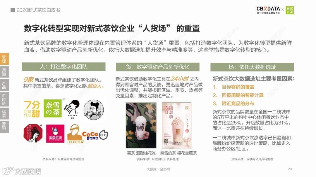《2020新式茶饮白皮书》显示,数字化转型已成为新式茶企的趋势,从选址、供应链、渠道、新品迭代和营销等方面进行的数字化搭建,将帮助品牌更快速准确地做出决策。深耕自身会员体系、线上数字化营销及数字化供应链搭建成为品牌的重中之重。