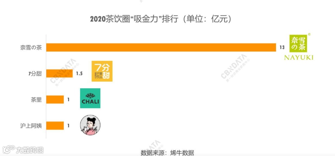 其中,新式连锁茶饮获得13起融资、茶包品牌获得3起融资,茶叶批发品牌获得1起融资、无人茶饮店获得1次 融资。
