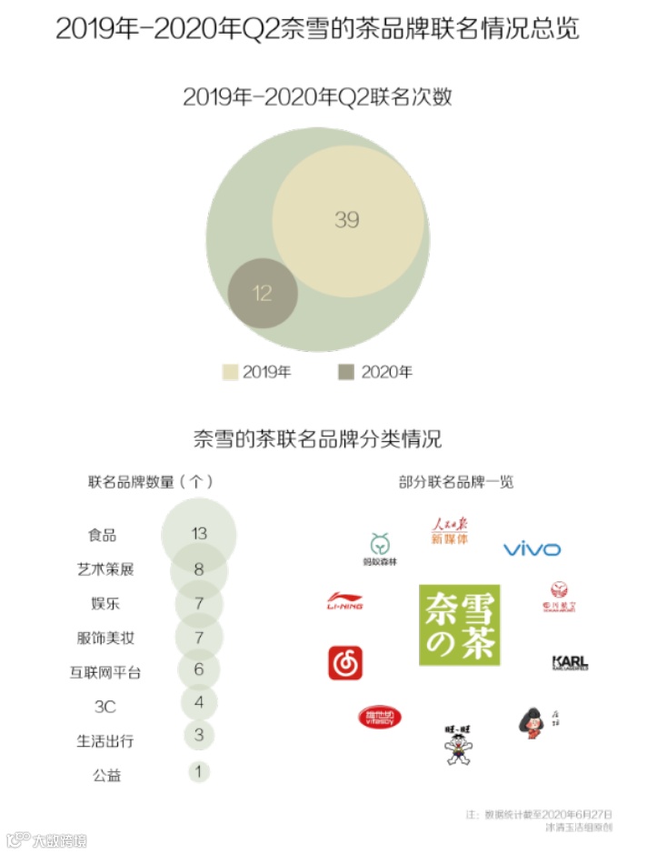 以奈雪为例, 2019-2020 年间,奈雪共联名过 51 次,涉及策展类、食品类和 3C 类等,融合双方共性推出了联名茶饮、欧包、周边及线下快闪店和主题门店。频繁联名的背后,奈雪的茶也在不断讲故事,强化自身的IP,传达品牌的调性。以期建立一个代表“美好、纯粹”生活方式品牌的终极目的。