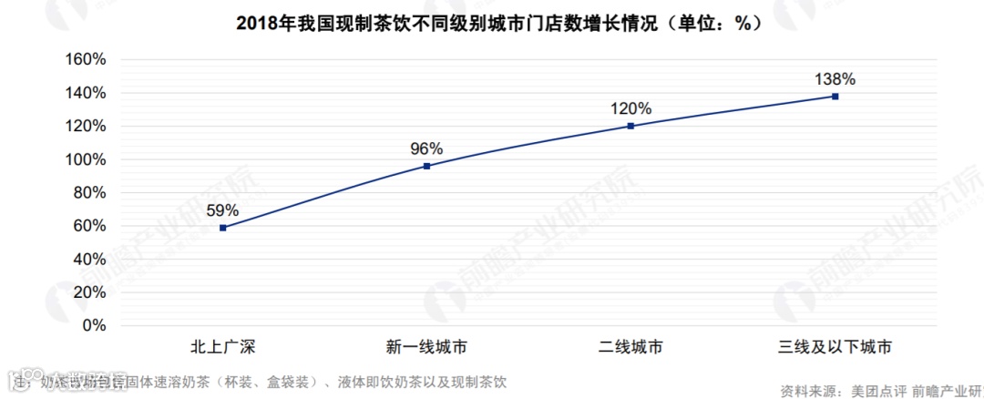 中国食品产业分析师朱丹蓬表示,经过最近这三年的高速发展之后,现在该赛道玩家跑马圈地其实已经到了中后阶段,一二线城市新式茶饮门店增速正在放缓。艾媒咨询数据显示,2016-2019年,三线及以下城市茶饮市场增长达到了138%,超过北上广及新一线城市120%的增长率;同时,三线及以下城市茶饮门店关店率为15%,也远低于一线城市茶饮门店55%的关店率。