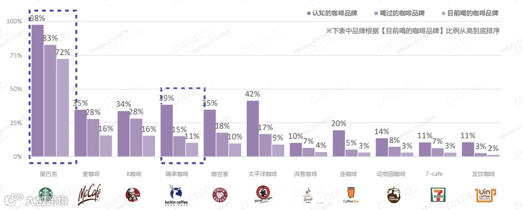 从品牌市场上看,星巴克进入中国市场较早,是目前中国最大的连锁咖啡品牌,品牌认知率和饮用率总体领先其他现磨咖啡品牌。而据《咖啡市场趋势洞察报告》显示,根据目前饮用率,成立不久的新零售咖啡品牌瑞幸咖啡跻身专业连锁咖啡品牌第二。
