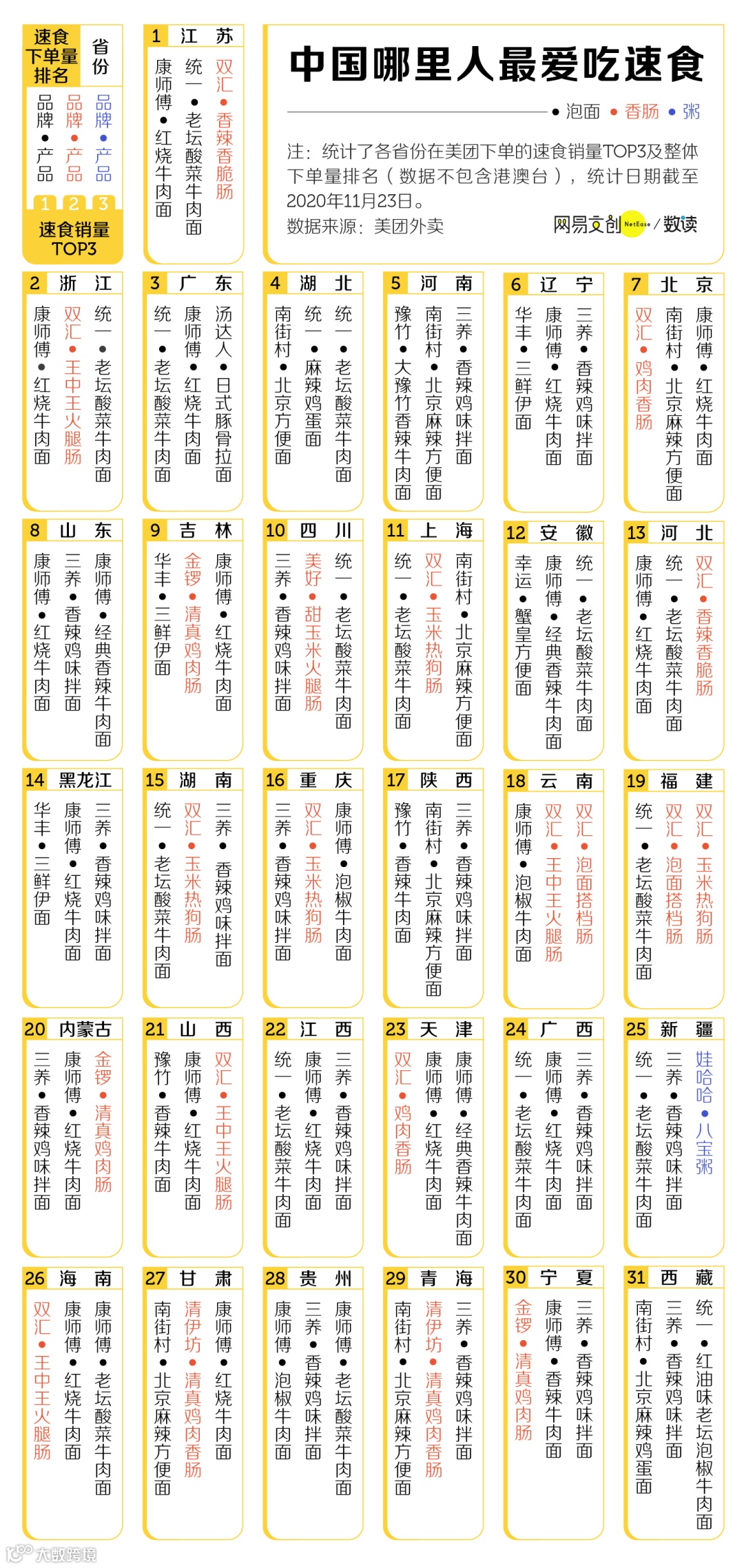 数据显示,中国各省份在美团下单的速食销量 TOP 3 中,接近六成的省份都是泡面加肠的组合,如果进一步看 TOP 5,包含这个组合的比例可以上升到近八成。