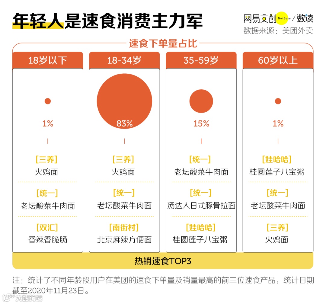 从地域上看,“包邮区”人民最爱速食,而从年龄上看,离不开速食的毫无疑问当属年轻人。