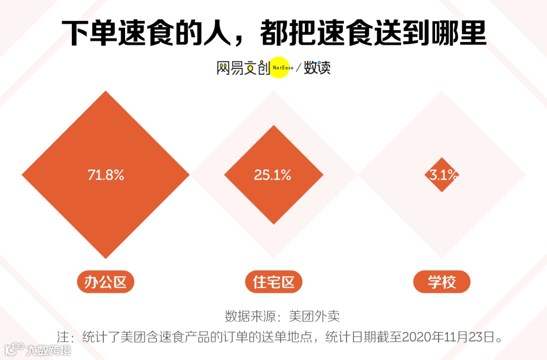 作为速食消费的主力军,吃速食的年轻人以社畜居多。数据显示,在美团下单的速食,有 71.8% 送到了办公区。